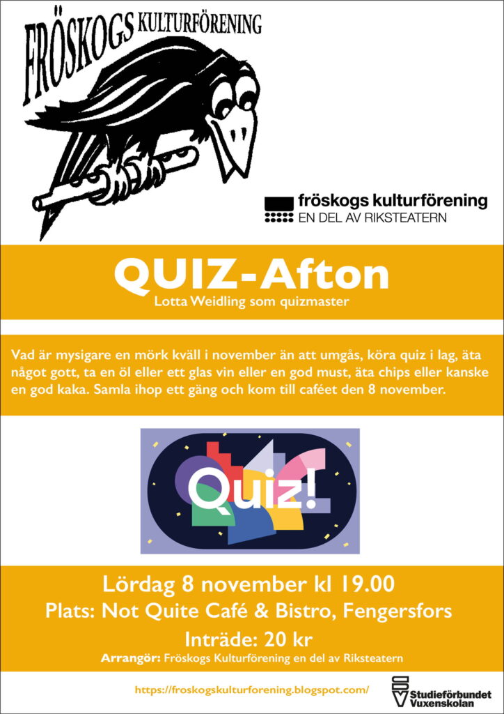 På lördag 8 november arrangerar Fröskogs Kulturförening en del av Riksteatern en Quiz-afton på caféet. Vill du säkra din plats, anmäl dig eller ditt lag på cafe@notquite.se eller kom i tid, öppet från kl 18. Det är mycket på gång i höst och vinter på caféet, kolla in café-sidan för att inte missa något!
