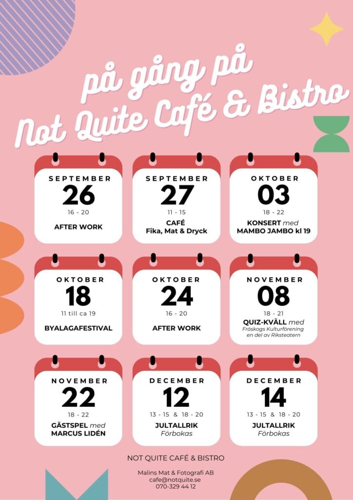 Säsongen 2025 har caféet en ny arrendator, Malin Robertson Harén, som är fotograf, kock och medlem i Not Quite sedan 2003 och hon har arbetat i köket på caféet i många år, både med matlagning och bakning och långt innan hon utbildade sig till kock 2022-2023. Malin var 2024 ansvarig tillsammans med Ida men i år står hon helt på egna ben. Som gäst kommer man känna igen mycket, både i interiören och menyn men självklart kommer det bli endel förändringar. Allt lagas och bakas från grunden med råvaror i säsong så långt det går och det är smaker från både Sverige, Korea, Italien och andra länder, både klassiska rätter som Kålpudding, Caesarsallad till Bouillabaisse, Bibimbap och annat gott eller vad jag nu hittar på till denna säsongen. Liksom förra året kommer det även bli Tema-kvällar med mat från olika länder som bokas i förväg. Nytt för i år är att jag kommer bjuda in andra kockar för gästspel då och då och min önskan är också att det blir fler evenemang än förra året.