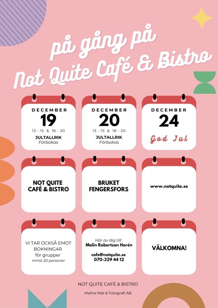 I den gamla smedjan på Fengersfors bruk huserar sedan 2003 Not Quite Café och Bistro. Här har det genom åren bjudits på musik och spelningar utöver många måltider, rykande koppar kaffe, blommande tårtor och extra smöriga bullar från bageriet Brukets godaste som ligger på andra sidan trädgården. Många skulle beskriva caféet som hjärtat på bruket. Det är här en kan slå sig ned, bli serverad någonting en aldrig kunde fantisera om och fylla på lite ny energi genom magen för att sedan vandra vidare in i fabriken för nya intryck och äventyr.