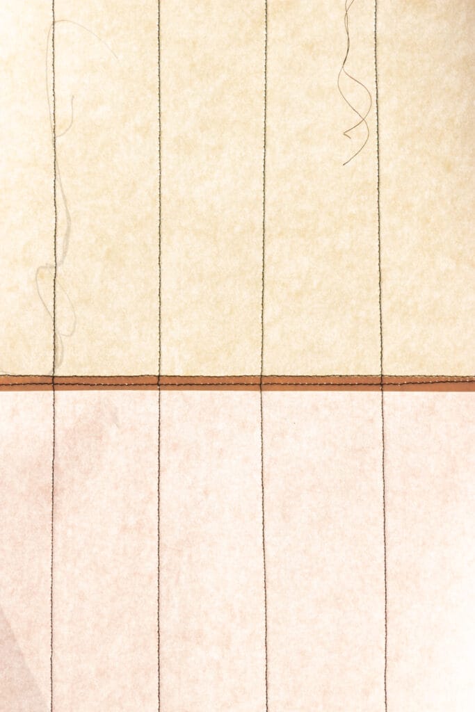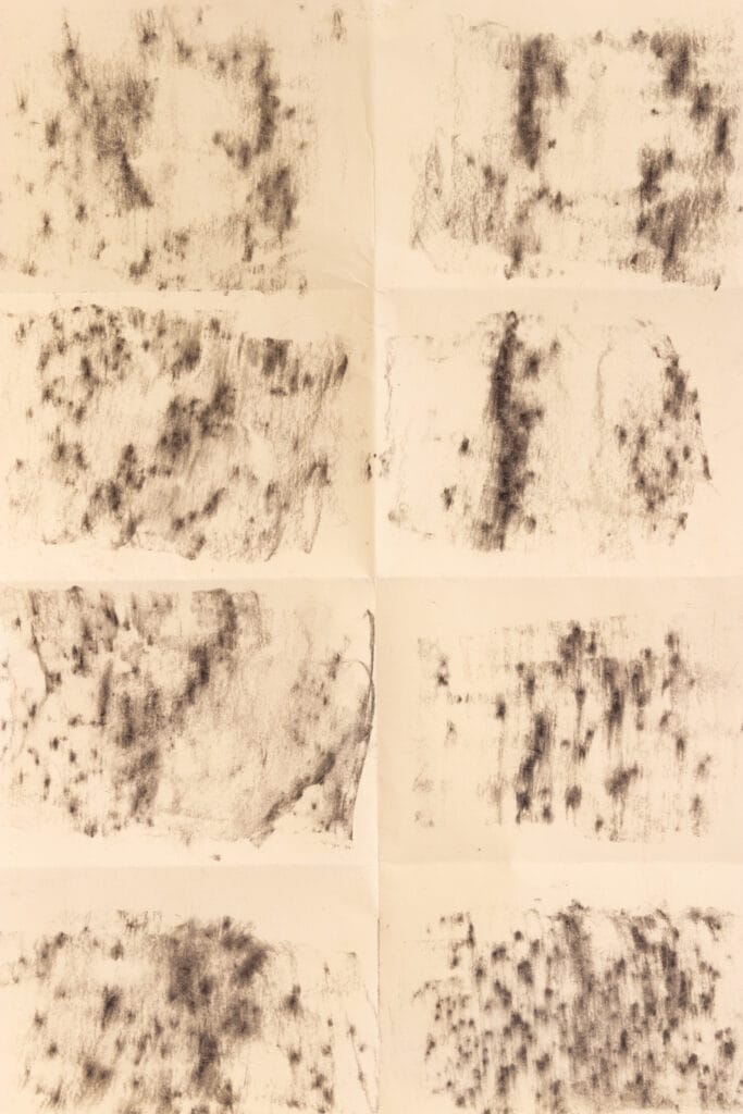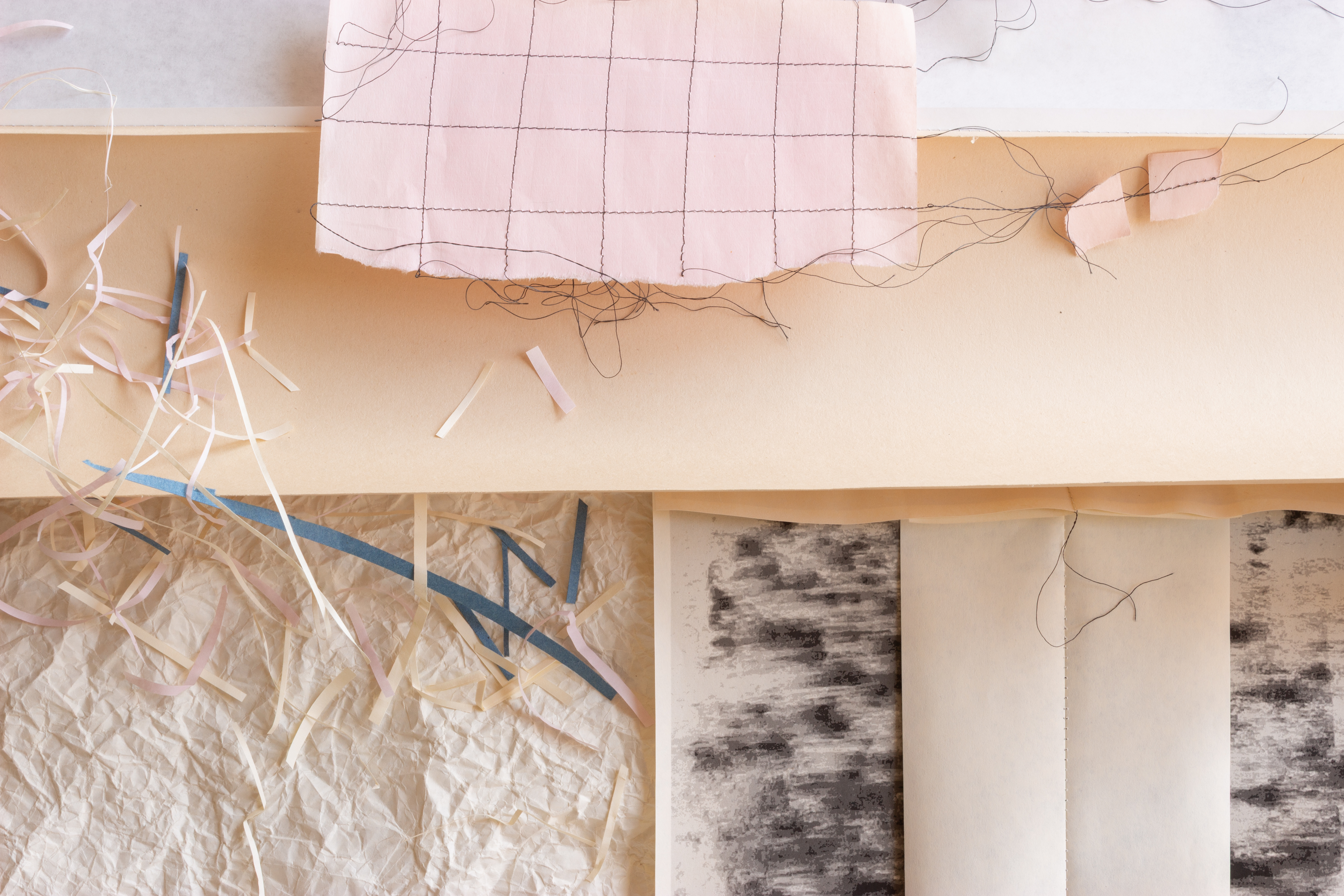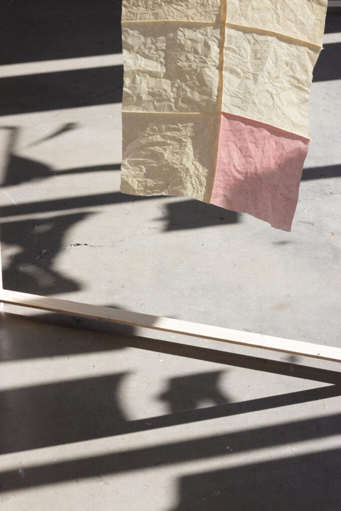 Frågorna har under året för oss fått två svar: I görandet, och här. I utställningen utforskar vi att vara i görandet tillsammans och vad det kan innebära för vår process. Vi har använt pappret för att pröva hur just vårt samarbete kan se ut i ett gemensamt material. Tillsammans gestaltar vi både tiden som är nu, tiden som går som i cirklar in i våra liv och en svunnen tid som gör sig påmind på platsen vi besöker och lånar.